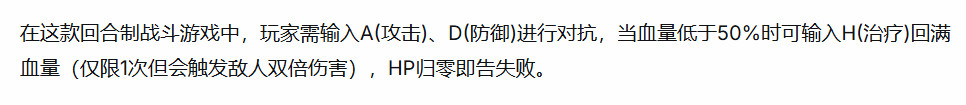 1) 若玩家使用治疗(H),本回合敌人必定攻击(A),且敌人伤害翻倍(×2)。