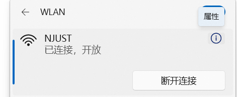 因为电脑不同,有时会找不到网络属性,还可以直接查看连接的 WiFi ,右侧圆形里面带 i 的标志直接找到。
