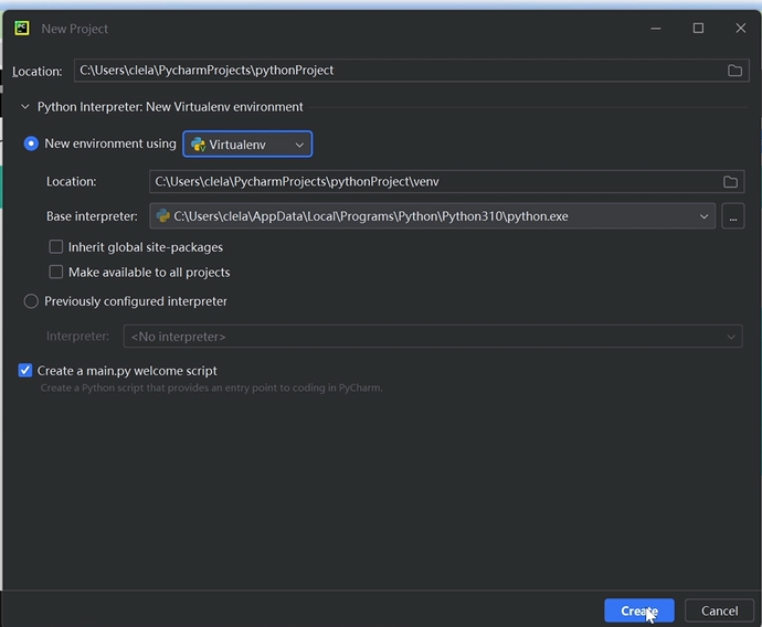 打开 Pycharm,点击 new project 创建新项目,起一个合适的名字,当前用默认的虚拟环境创建。
